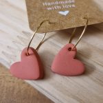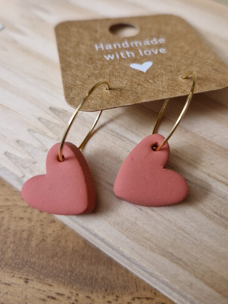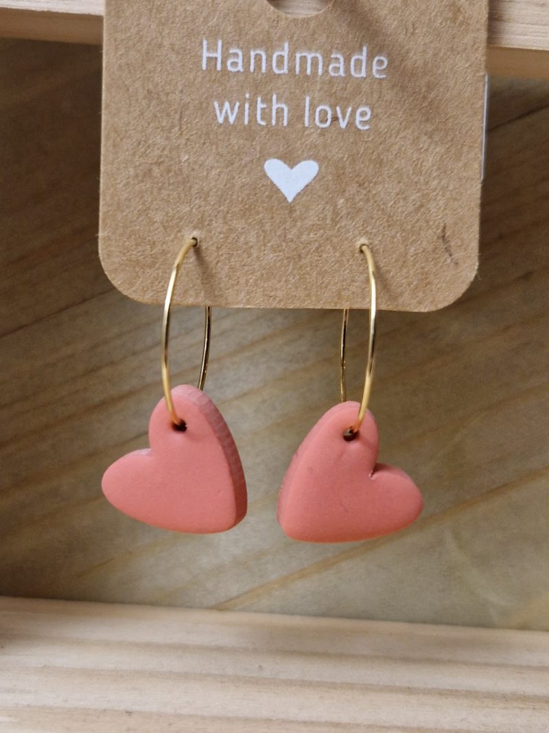 Diese Edelstahlcreolen mit Fimo Herzchen in Pastellrot sind schlicht und elegant.