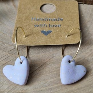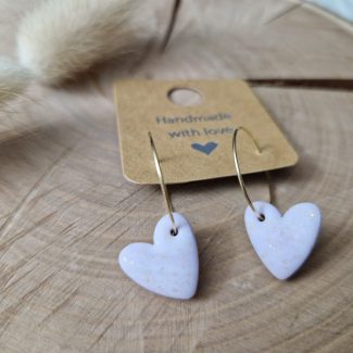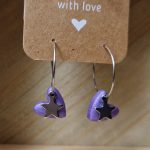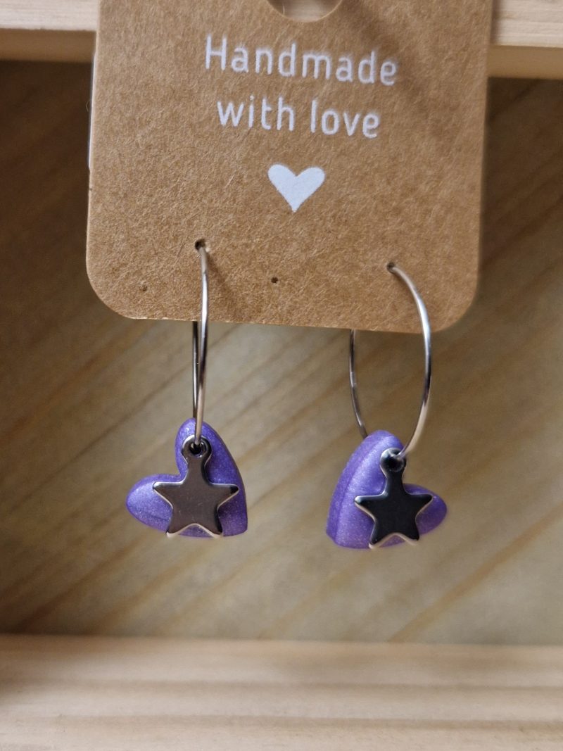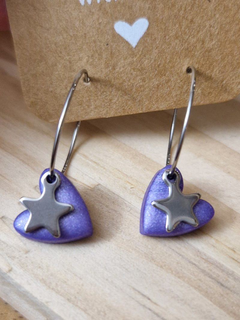 Diese Edelstahlcreolen mit Fimo Herzchen in Lila Metallic sind durch den kleinen Sternchenanhänger ein Hingucker.
