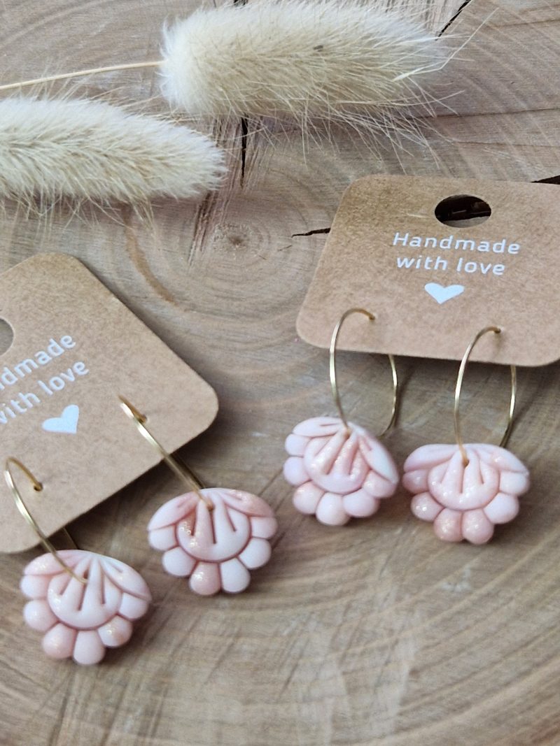 Leichte Farben gewünscht und doch ein Blickfang? Dann sind diese schönen goldenen Creolen genau passend. Die Blümchen haben einen wunderschönen Schimmer.