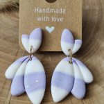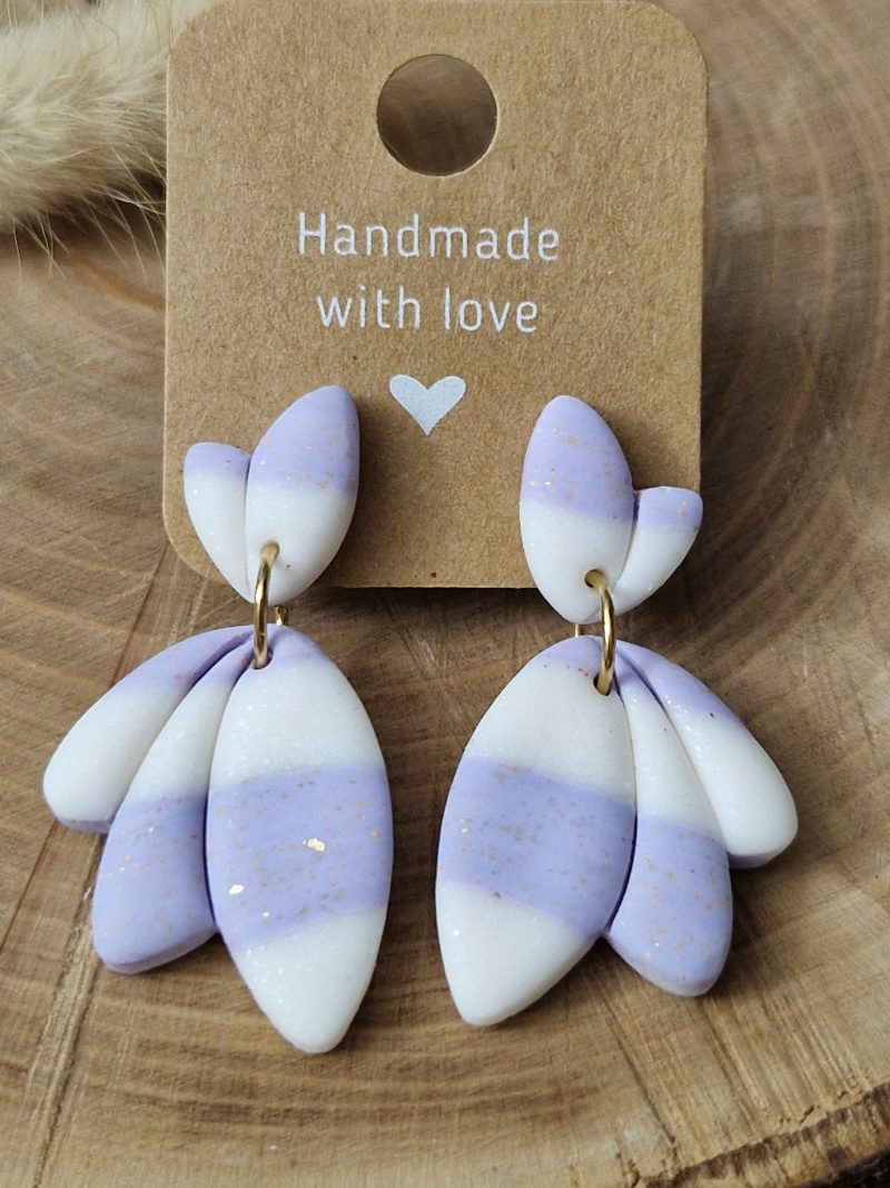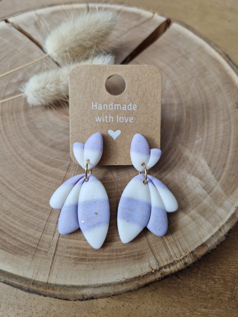 Das ist ein richtiger Hingucker… Diese handgemachten Fimo Ohrhänger  in Lila/Weiß mit goldenen Akzenten sind ein absoluter Blütentraum.