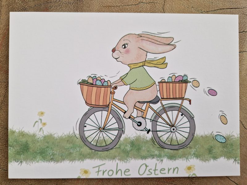Postkarte Osterhase fährt Fahrrad