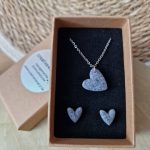 Ein schönes Schmuckset bestehend aus einer silbernen Edelstahlkette 50 cm mit einem Fimo Herzanhänger und einem Paar Herzohrstecker in einer Granit Optik.