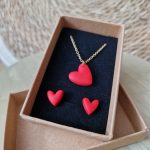 Ein schönes Schmuckset bestehend aus einer goldenen Edelstahlkette 50 cm mit einem Fimo Herzanhänger und einem Paar Herzohrstecker in Knallrot.