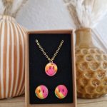 Ein schönes Schmuckset bestehend aus einer goldenen Edelstahlkette 50 cm mit einem Fimo Herzanhänger und einem Paar Herzohrstecker in Neon.